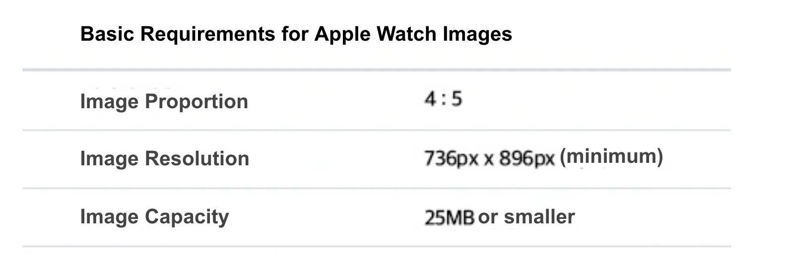 For Apple Watch, we recommend you a 4:5 proportion and a resolution of 736 px X 896 px.