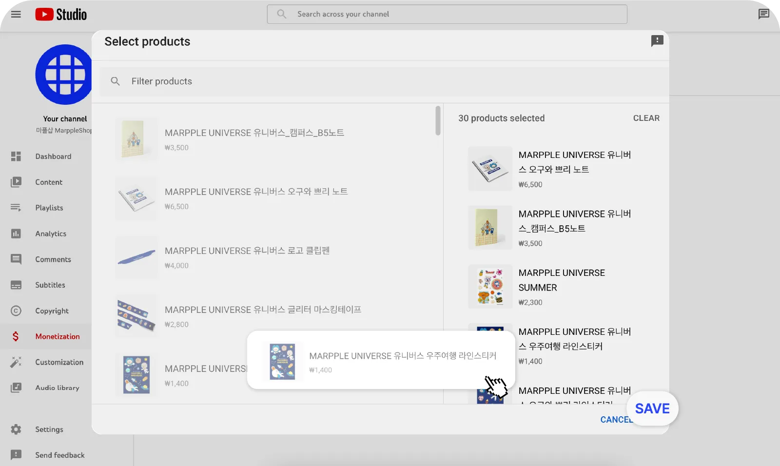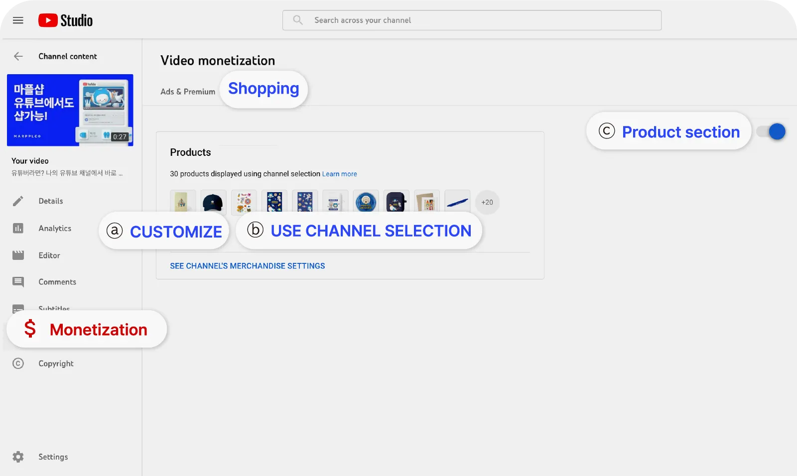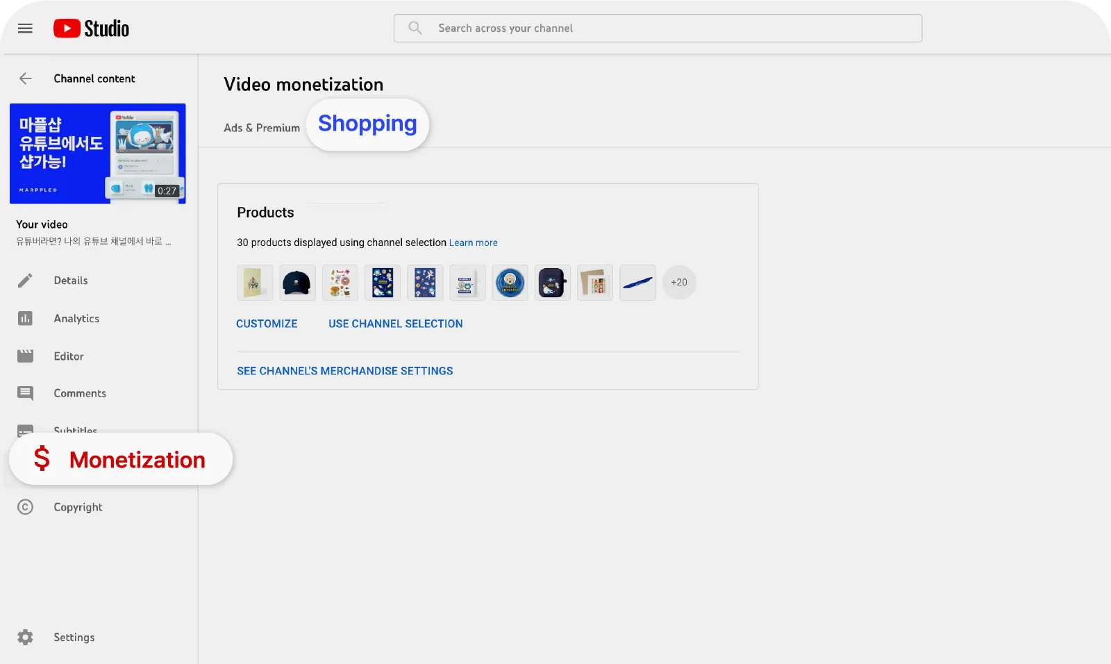 1~3 days after you link your MarppleShop with your channel, you can check your goods in YouTube Studio → Monetization → Shopping.
