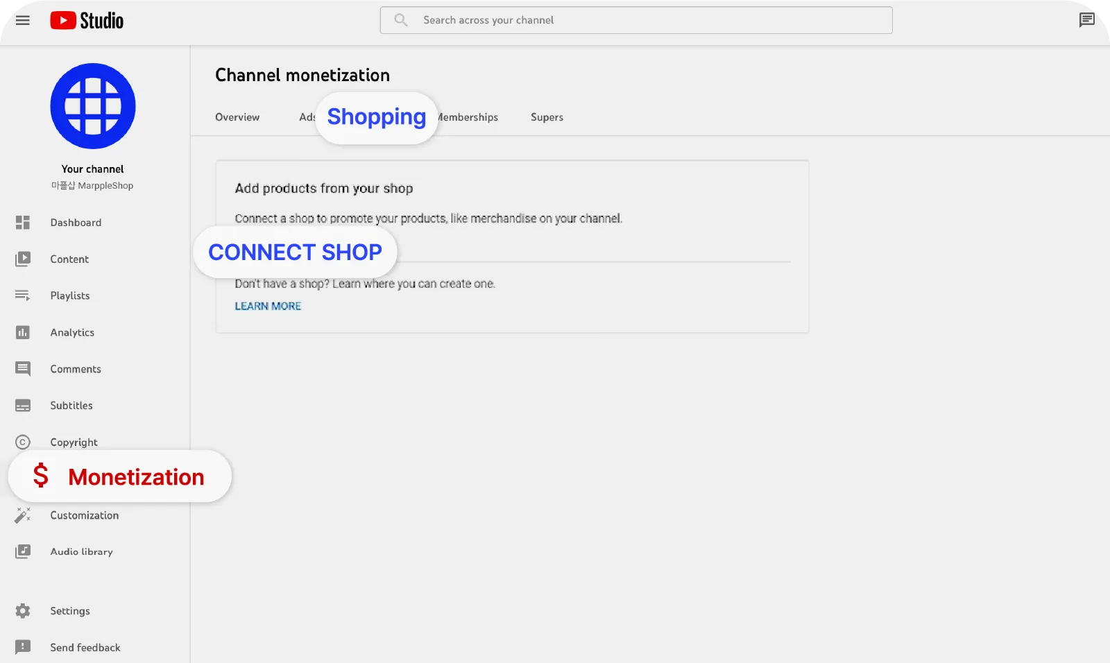 YouTube Studio → Monetization → Click “Connect shop” in the Shopping tab → You can now link your MarppleShop with your YouTube account.