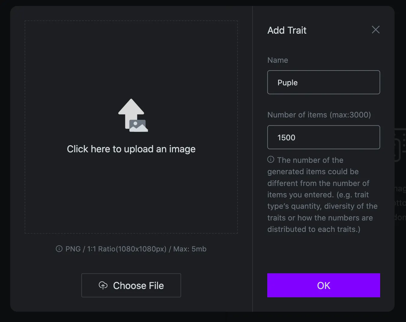 1. If you enter 5,000 for the number of items for Trait ‘Body’, the sum number of body part items cannot exceed 5,000.