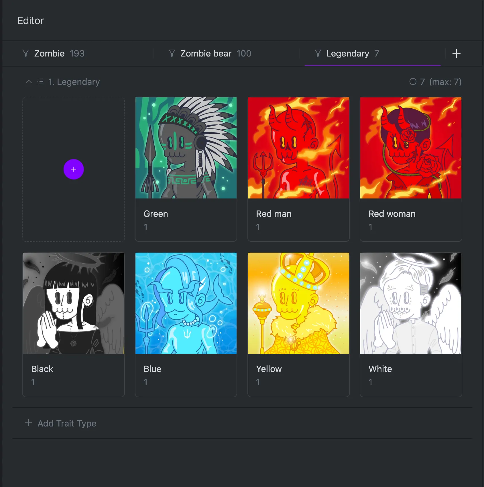 If you have a total of 100 PFPs under the Zombie Bear theme and a total of 60 “Wear” trait type items, then Zombie Bears will have a wear on with a 60% chance. Some Zombie Bears will have a wear on while others will not. You can apply this feature not only on wears but also on various types such as hair, accessories, tools, etc.