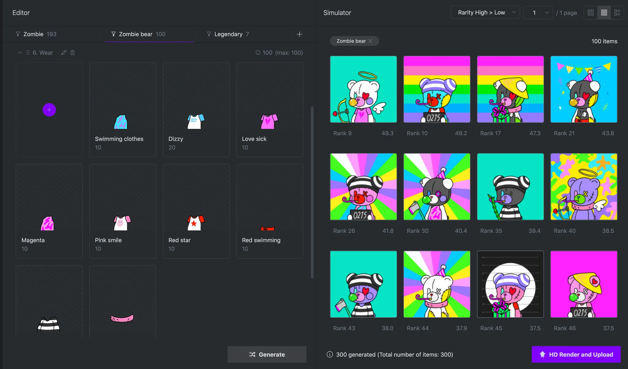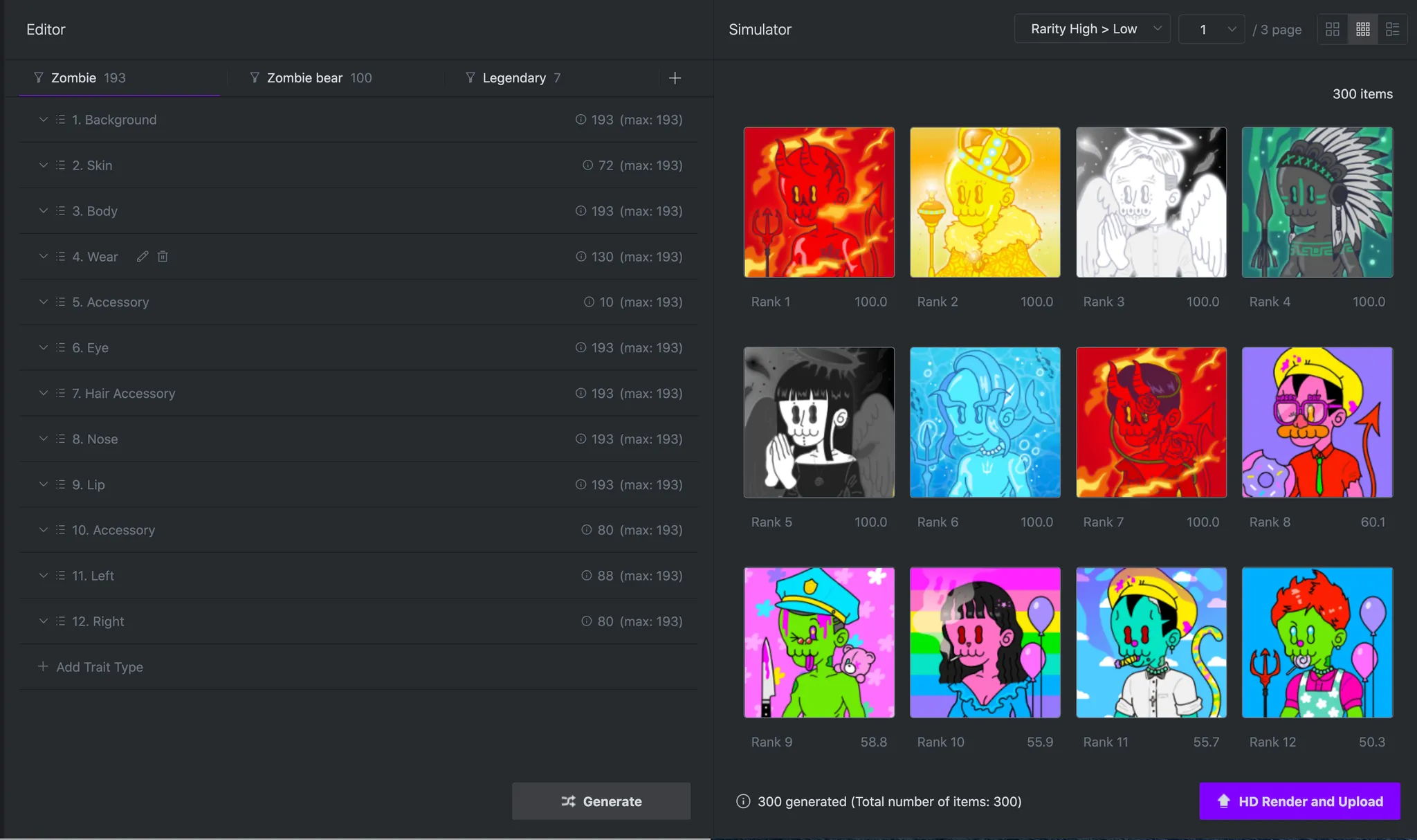 Once you have uploaded all parts, click the “Generate” button in the lower left corner of the editor. Generative Art Builder will then render parts and synthesize PFPs in Simulator. The images you see in Simulator are low-quality, fast-rendered images. They show differences in quality with the images that have gone through “HD Render and Upload”. You can check if parts are properly located and ordered. If the you are not satisfied with the result or if the rendering has gone wrong, you can regenerate the images.