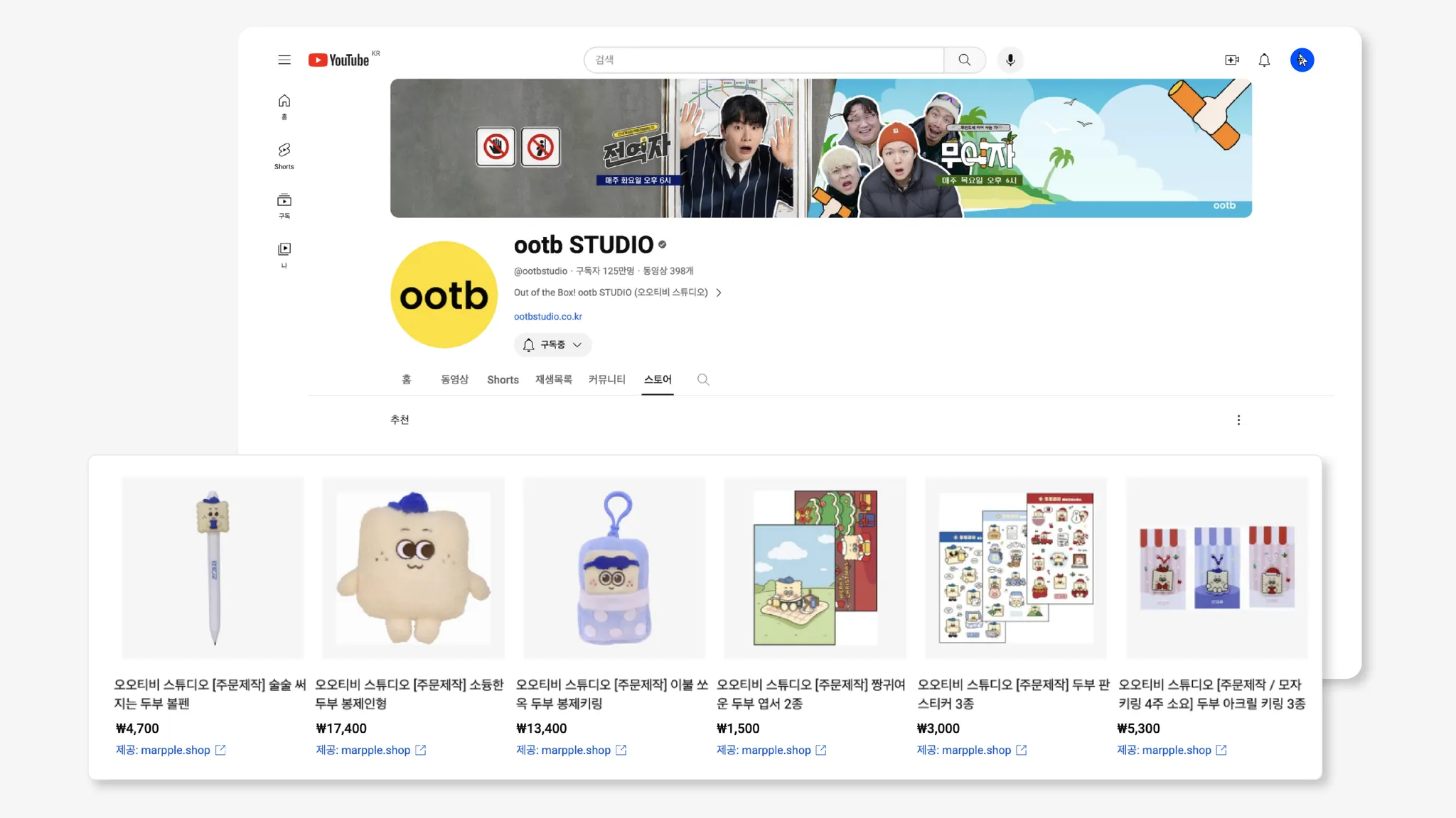 유튜브에서 손쉽게 채널 내 스토어의 제품이나, 다른 브랜드의 제품을 판매하고 홍보할 수 있는 서비스예요.