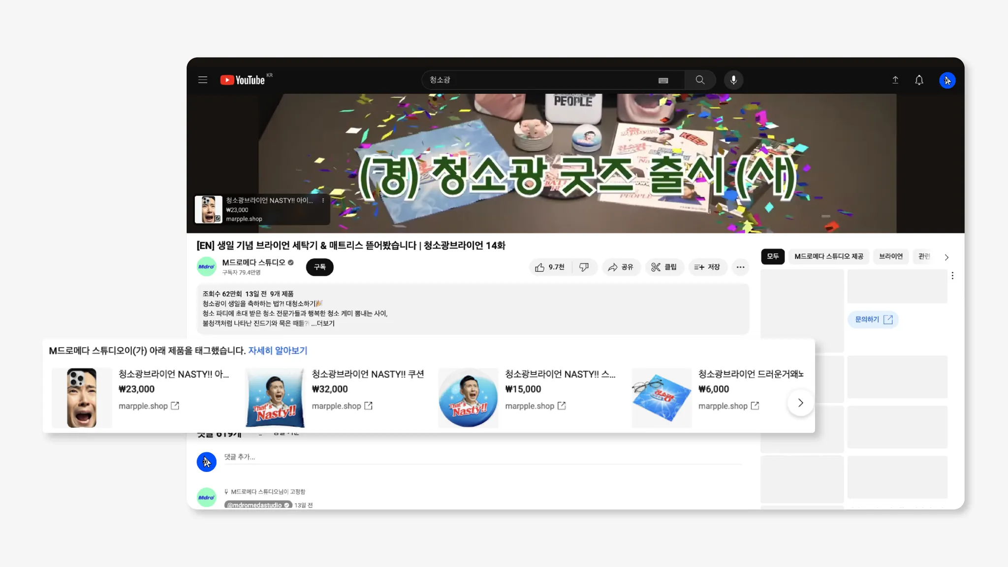 유튜브 쇼핑은 유튜브 숏츠, 라이브 스트림, 영상 등 다양한 영상에도 상품을 판매할 수 있어,출시 이후 다양한 브랜드, 크리에이터들이 유튜브 쇼핑을 활발하게 이용하고 있어요.