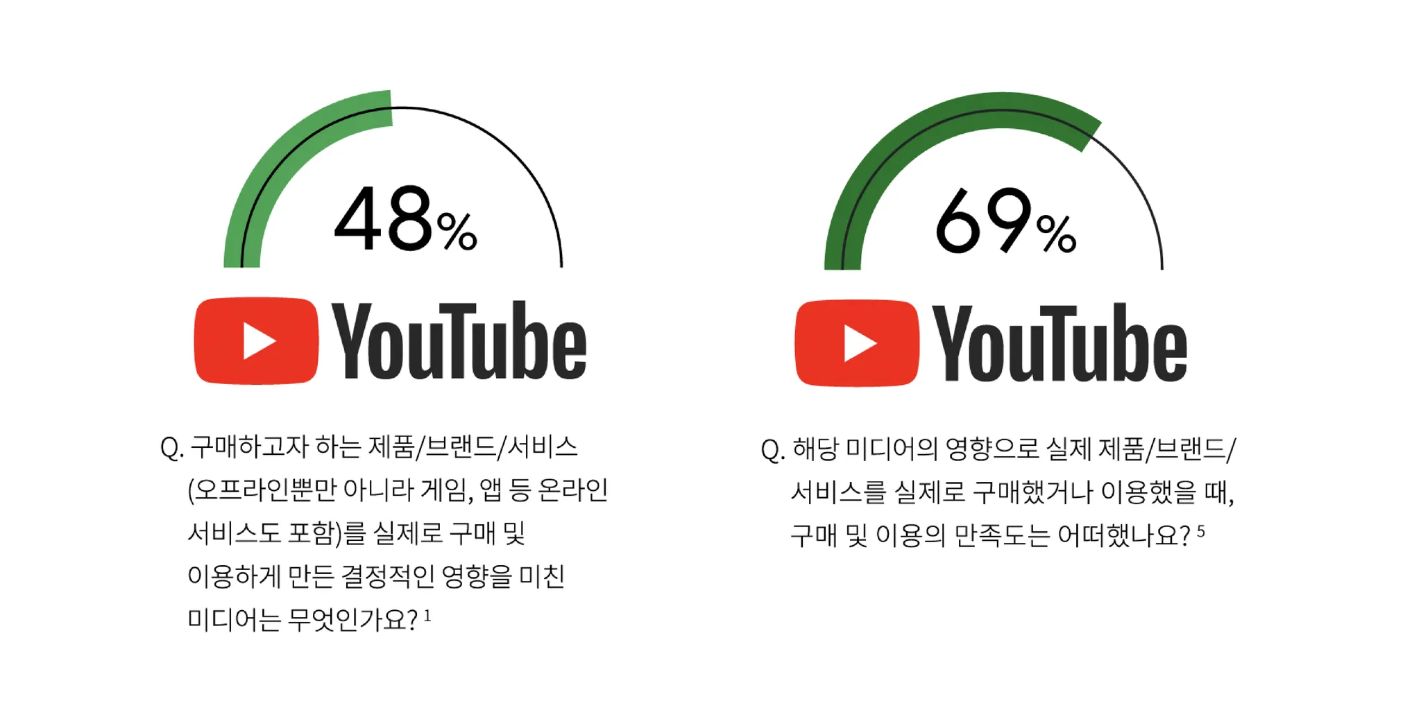 구글 설문조사에 따르면, 유튜브 영상을 시청한 후 제품을 구매하는 사람들이 무려 48%로, 압도적인 비중을 차지하고 있으며, 영상을 보고 구매한 사람들의 이용 만족도는 69%로 타 매체보다 상대적으로 높게 나타났는데요.