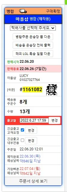 병합 주문서의 경우 첵포 날짜부터 순차 출고됨