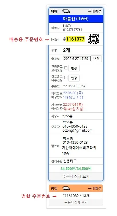 └ 개별 주문서 주문번호 (#0000000), 제품명 , 색상, 수량 등