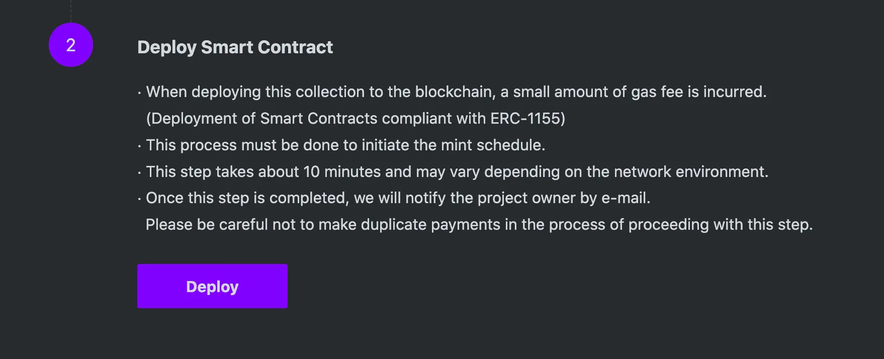 Once you complete the step above, the Deploy Smart Contract button will be activated. It is step for signing a Smart Contract, which requires gas fee. For details about how to send coins to your wallet, please refer to Purchasing Coins.